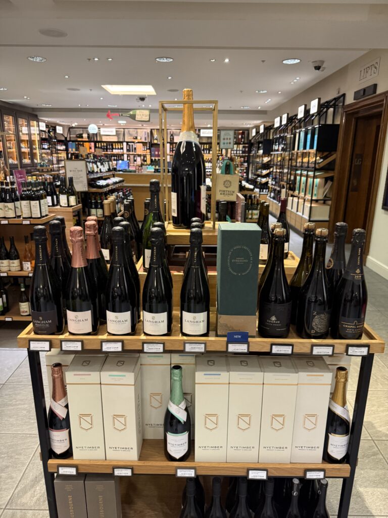 Champagne and popular British Sparkling wine Nytimber on display in Fortnum and Mason